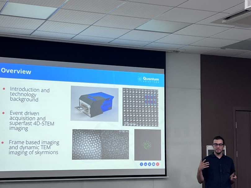 会议首场报告由Quantum Detectors Ltd.的Matus Krajnak博士带来,题为《Event- and Frame-based detection with Merlin T4 for Transmission Electron Microscopy》。报告中,Krajnak博士首先系统介绍了相关技术背景,随后重点讲解了Merlin T4所采用的事件驱动采集与超快4D-STEM成像这一革命性技术,阐述了其如何实现极高时间分辨率的数据捕获。最后,通过基于帧的成像技术对斯格明子(Skyrmions)的动态TEM成像的精彩案例,生动展示了该技术在观测拓扑磁性粒子等纳米尺度动态现象中的强大能力。整场报告层层深入,展现了先进表征技术为材料科学研究开辟的新视野。