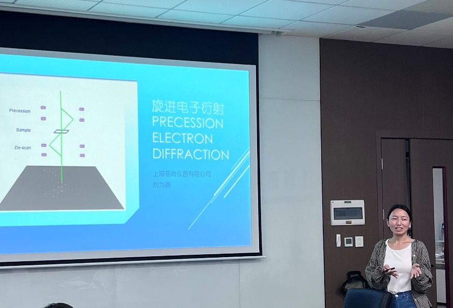 第二场报告由上海荟尚仪器有限公司的刘为燕工程师主讲,题目为《旋进电子衍射基本原理及其应用》。报告系统阐述了旋进电子衍射技术通过电子束偏离光轴入射样品,有效减弱动力散射,获得准运动学强度的衍射花样,从而实现对纳米晶体结构的高精度定量分析。她指出该技术可快速获取晶体取向、相分布、晶界、应变等多维信息,为材料微观结构研究提供有力支撑。