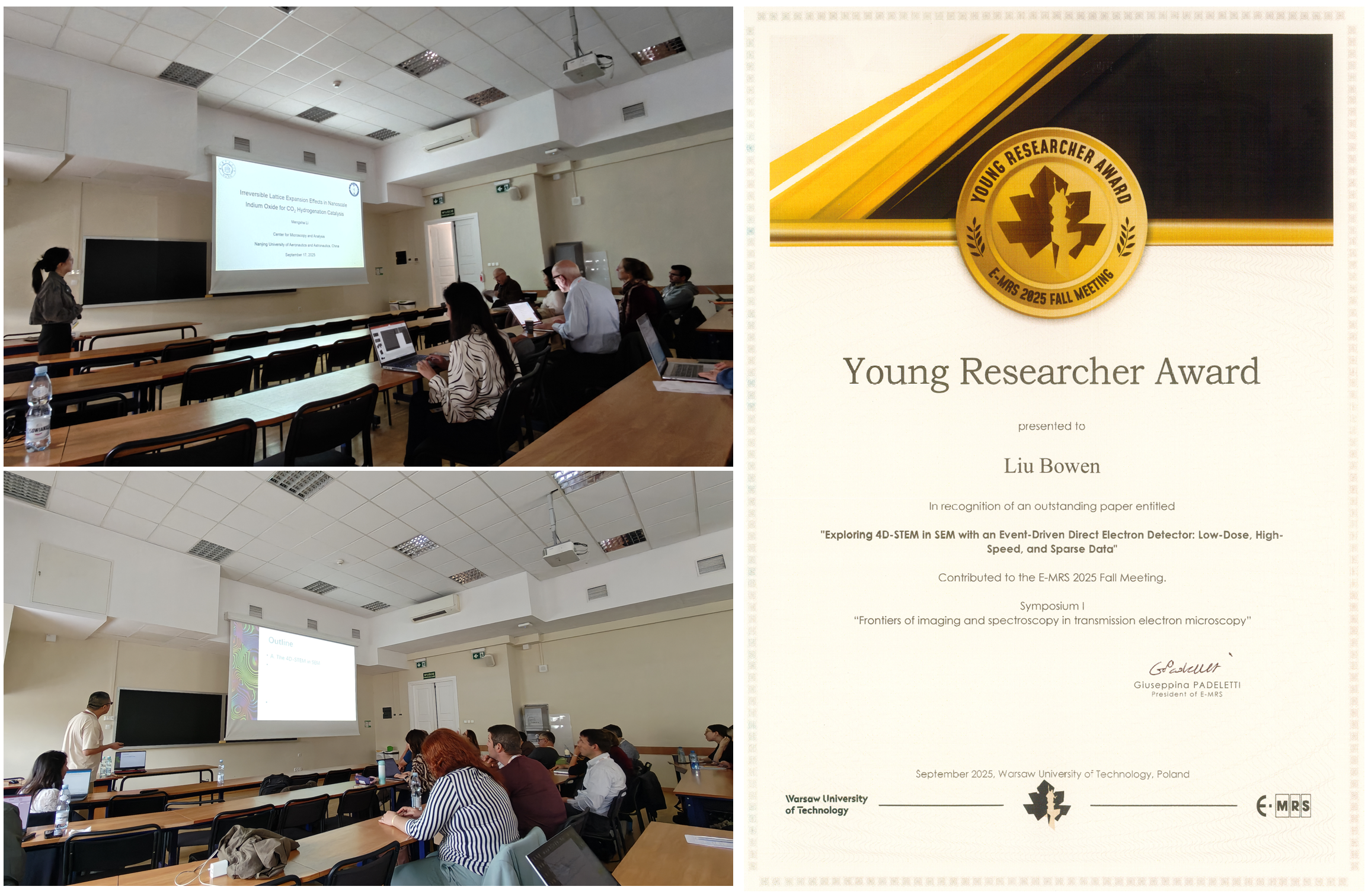 此次会议,我校分析测试中心派出两位学者在分会论坛做学术报告。李梦莎副研究员以《Irreversible Lattice Expansion Effects in Nanoscale Indium Oxide for CO2 Hydrogenation Catalysis》为题、博士生刘博文围绕《Exploring 4D-STEM in SEM with an Event-Driven Direct Electron Detector: Low-Dose, High-Speed, and Sparse Data》,分享了中心在电子显微学方法开发上的最新成果。刘博文荣获本次EMRS秋季会议“Young Research Award”,该奖项用以表彰和鼓励在材料研究领域做出突出研究成果、表现出未来发展潜力的研究生。